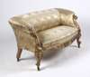 of small proportions, the cushioned back and arms over sprung seat, floral carved apron raised on cabriole legs terminating in C-scrolls with brass castors