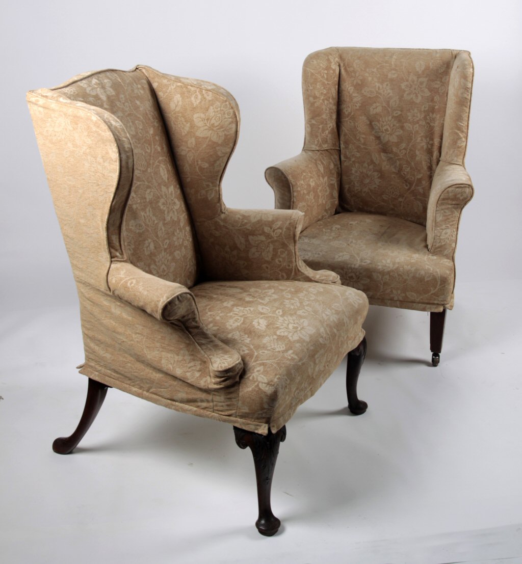 the arched cushioned back over cushioned seat raised on acanthus carved cabriole legs terminating in pad feet, 87cm wide, 120cm high; and a Victorian wing armchair, the cushioned back over sprung seat raised on square tapering legs terminating in brass castors (2)