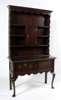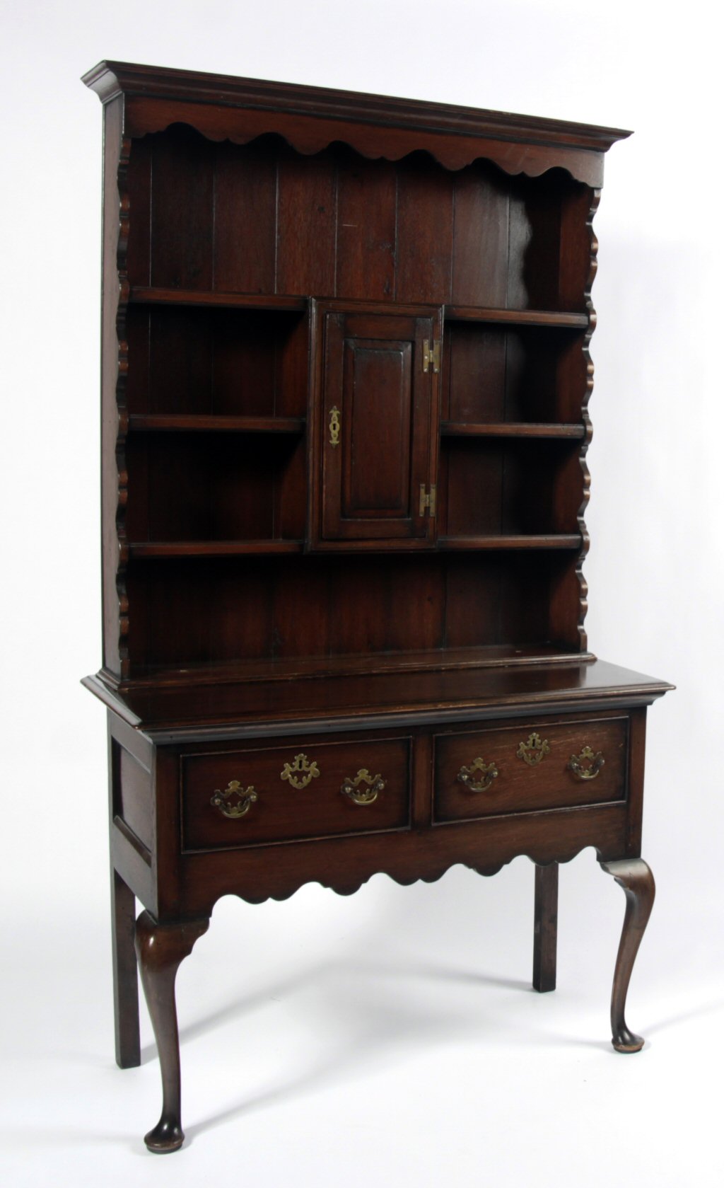 the projected moulded cornice with shaped apron over three open shelves with central door, over two short drawers raised on cabriole legs terminating in pad feet