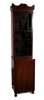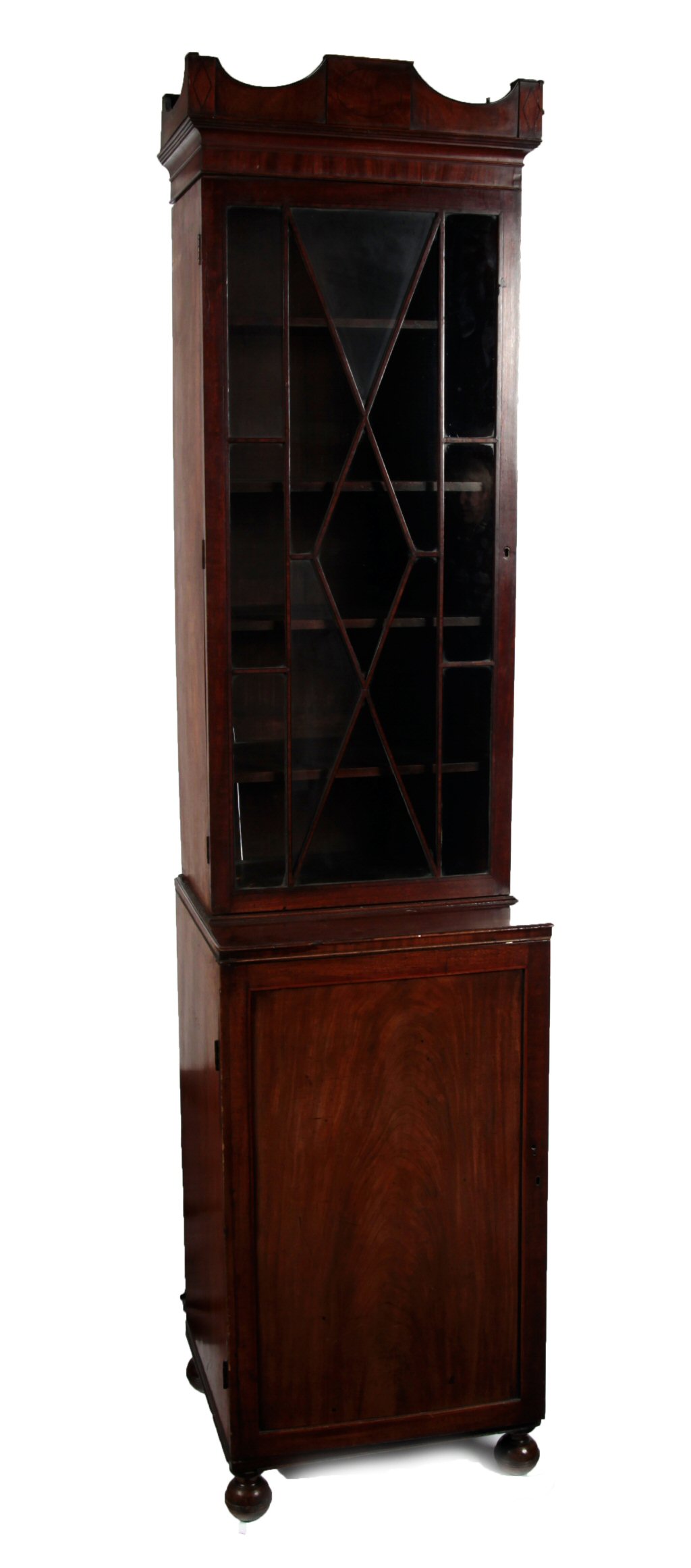 the castellated cornice over an astragal glazed door enclosing adjustable shelves above a panelled door enclosing shelves, raised on bun feet
