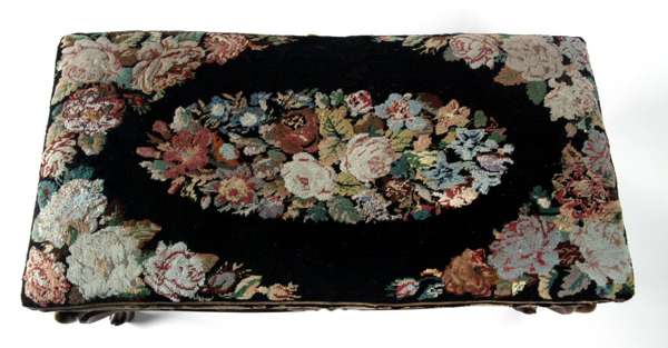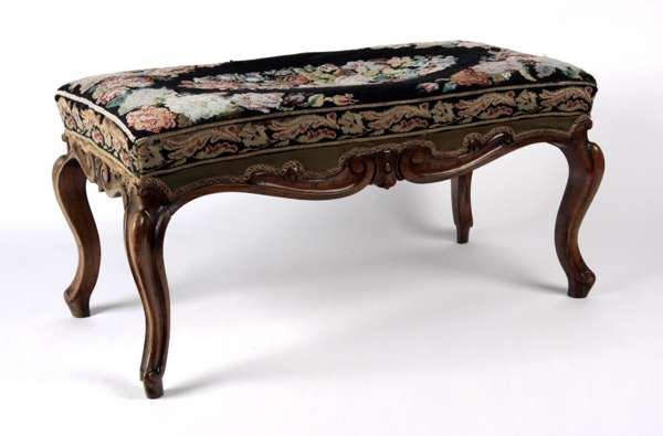 the rectangular tapestry seat over a scroll carved apron raised on cabriole legs