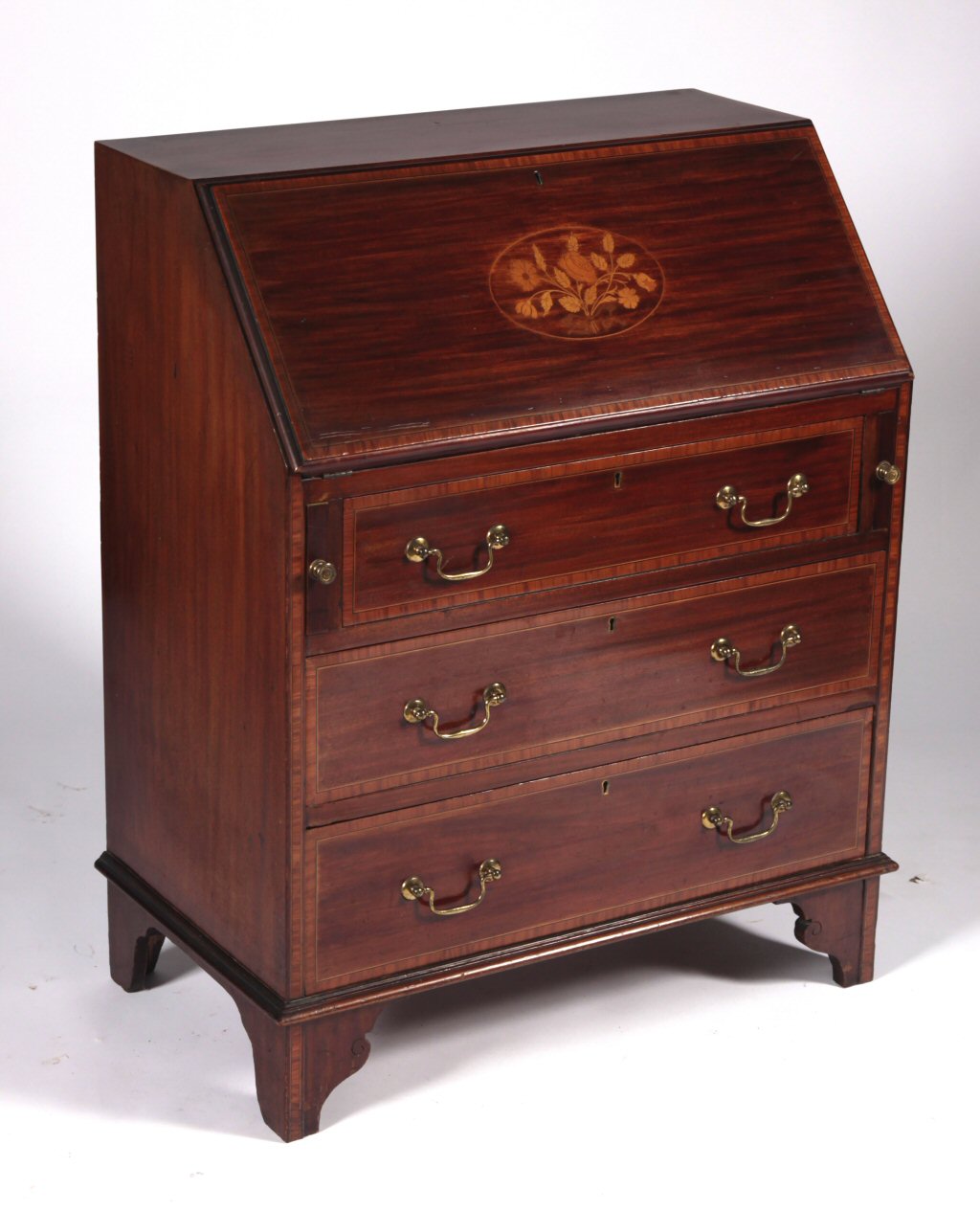 the crossbanded moulded fall-flap enclosing simple fitted interior over three graduated long drawers raised on bracket feet