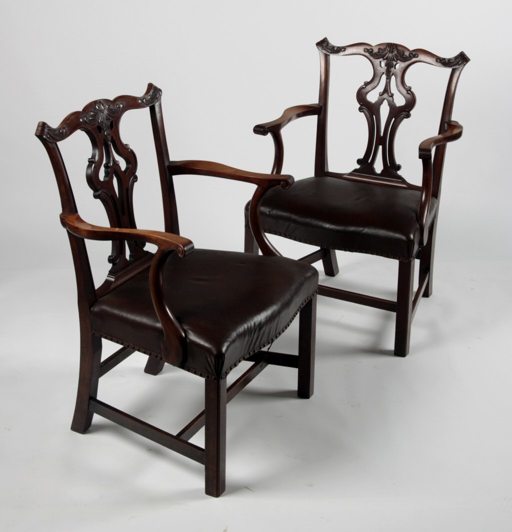 each with acanthus carved serpentine top rail over elaborate vase shaped splat, serpentine arms, cushioned seat raised on square legs united by H form stretchers (2)