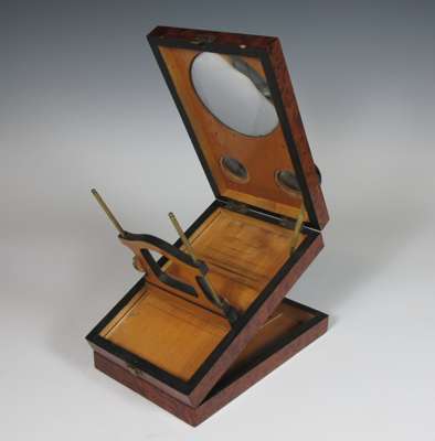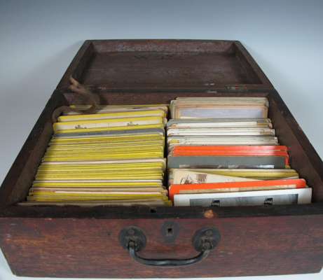 with three lenses and ebonised mounts; and a box of slides of British, American and World views (qty)