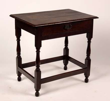the rounded rectangular top over a frieze drawer raised on baluster turned legs united by peripheral stretchers, on bun feet