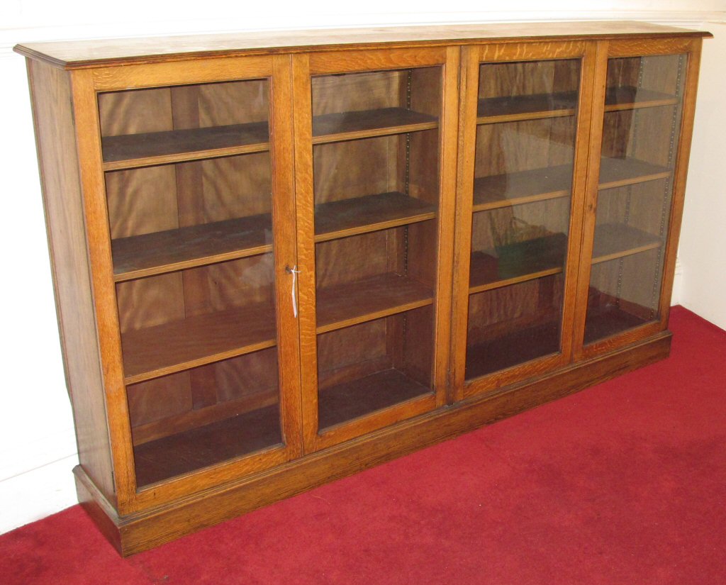 the moulded rectangular top over four glazed doors, enclosing adjustable shelves, raised on plinth base