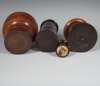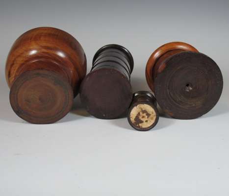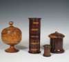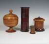 of cylindrical form, composed of five compartments, 22cm high; a treen urn and cover of turned form, 19cm high; a treen string box of turned form, 12cm high; and a treen box of turned form, 7cm high (4)