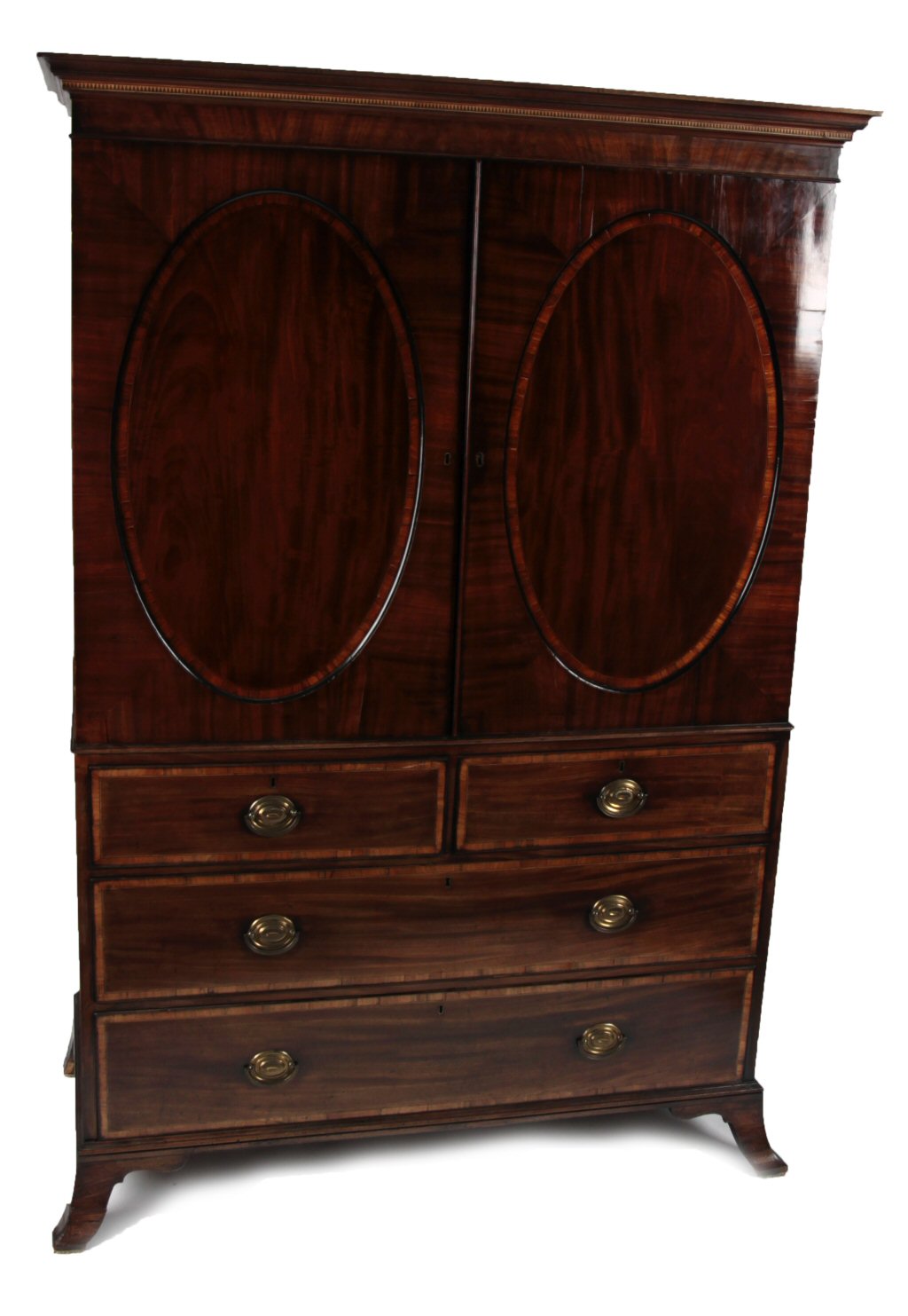 the projected moulded cornice over a plain frieze above crossbanded oval panelled doors, enclosing slides, above two short and three long drawers raised on splayed bracket feet