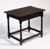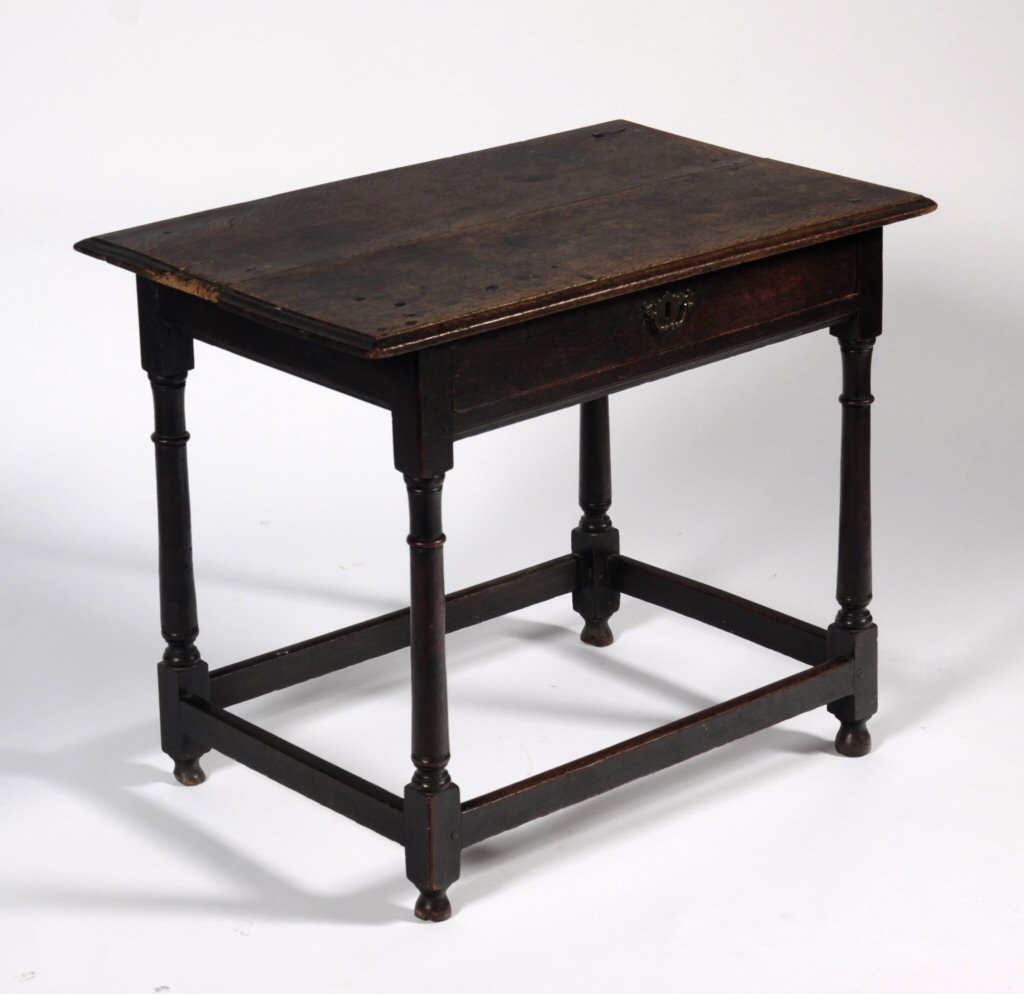 the moulded rectangular top over a single frieze drawer raised on turned legs terminating in block and bun feet, united by stretchers