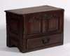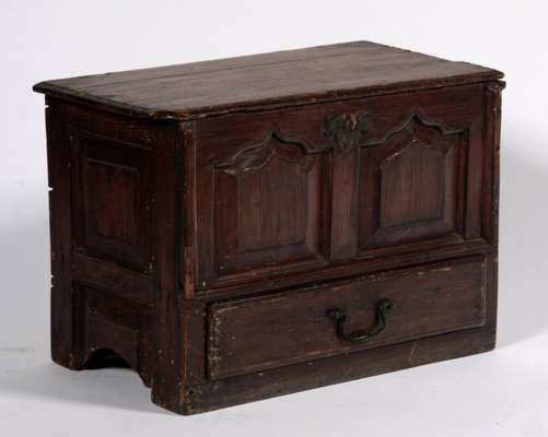 of rectangular form, the plain hinged cover over panelled sides above a single drawer