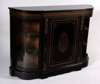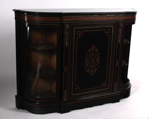 the plain top of broken bow front form above an inlaid central panel door with brass mounts flanked by two glazed cabinets (one lacking glass) on a plain base