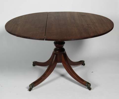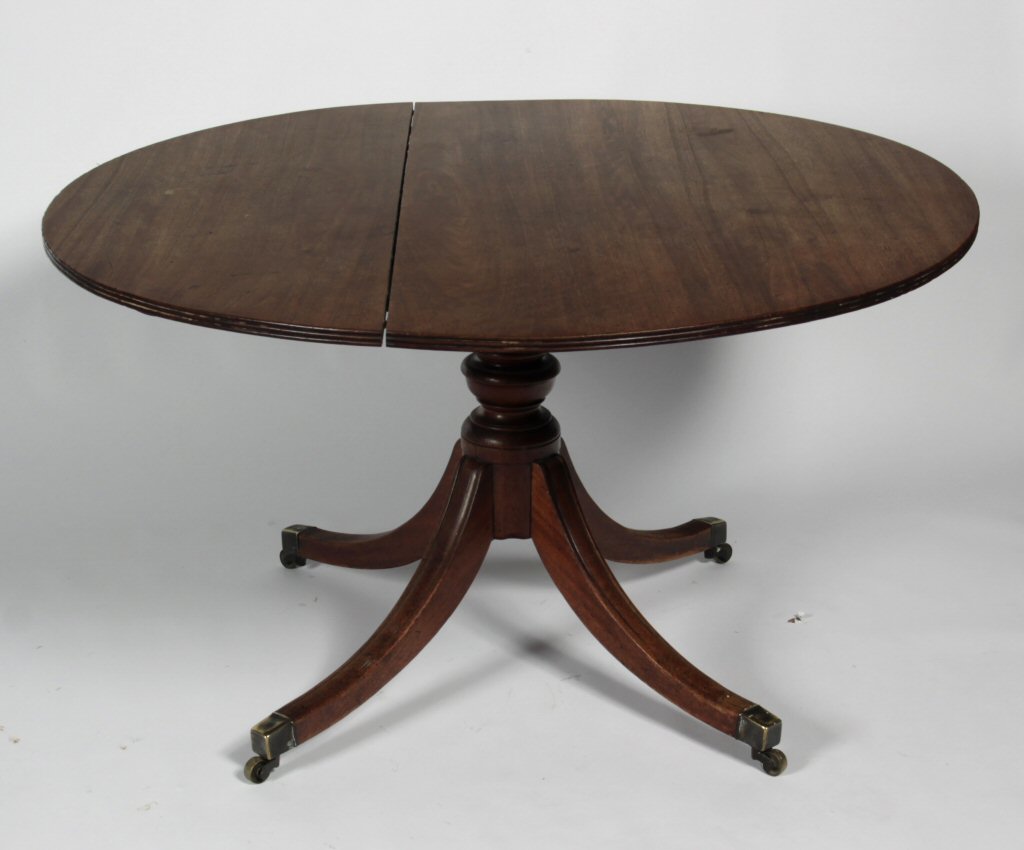 of circular form with reeded edge on a turned pedestal base with quadriform legs terminating in brass caps and castors