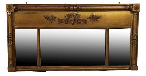 the top with a horizontal column over a frieze with floral scrollwork, the three bevelled mirror panels flanked by acanthus decorated columns