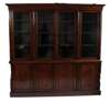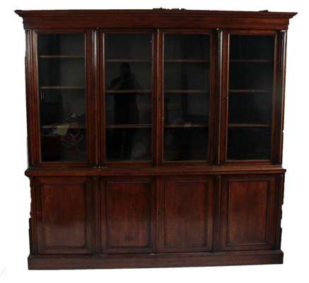 the projected cornice over four glazed doors, enclosing adjustable shelves, over four panelled doors raised on a plinth base