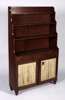 with four open shelves over two frieze drawers with crossbanded cloth panelled doors raised on squat baluster turned legs