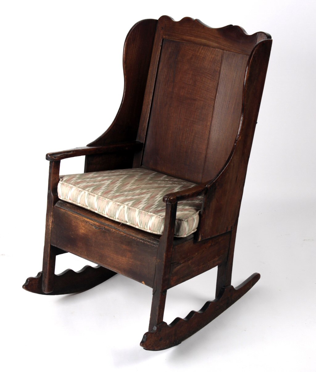 the serpentine top over panelled back flanked by wings with partial open arms over a plank seat with under drawer raised on square legs with rockers