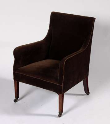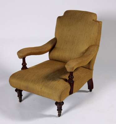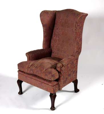 the serpentine back rail over out stretched scroll arms and loose cushioned seat raised on cabriole legs; and two other armchairs (3)