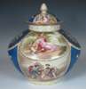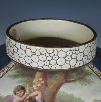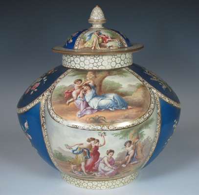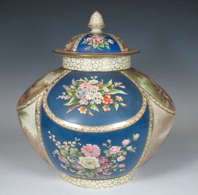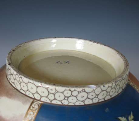 the lobed globular body decorated with opposing panels of figural scenes, on a blue ground decorated with foliate motifs, painted mark 'L & R' to base