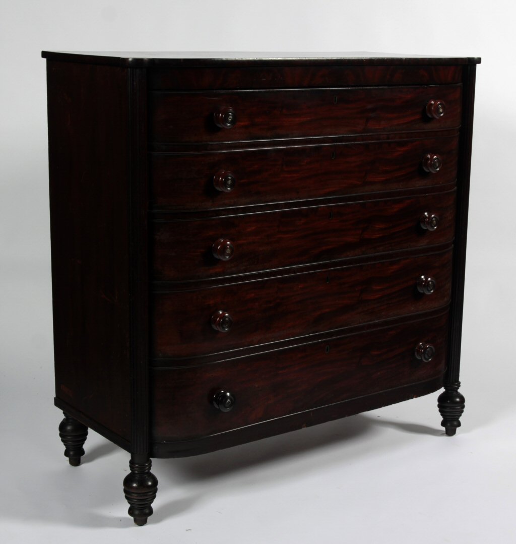 the shaped moulded top over a plain frieze above five graduated long drawers flanked by fluted columns raised on turned supports