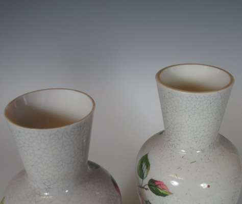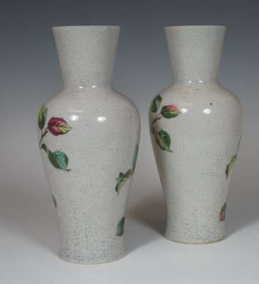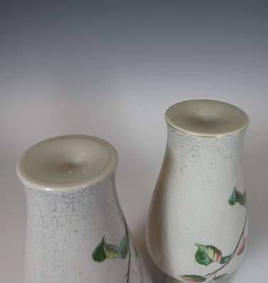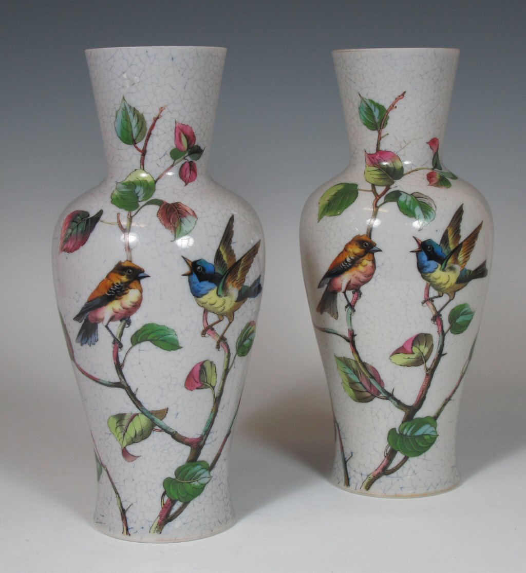 each of baluster form, decorated in polychrome with birds on branches on a crackle ground (2)