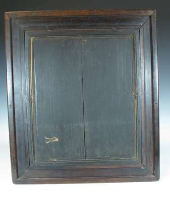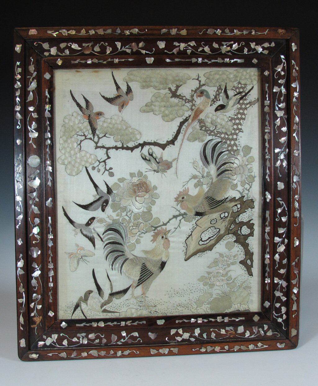 decorated with cockerels, butterflies and birds on flowering branches and rockwork, the hardwood frame with foliate mother of pearl inlay