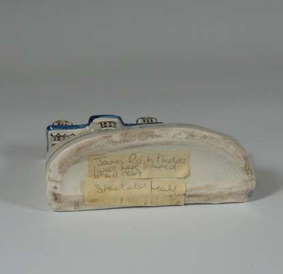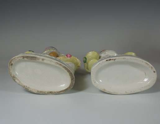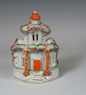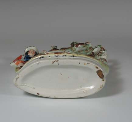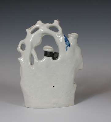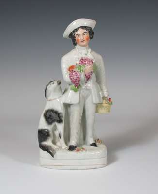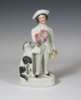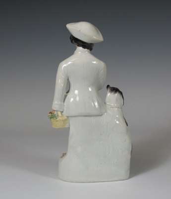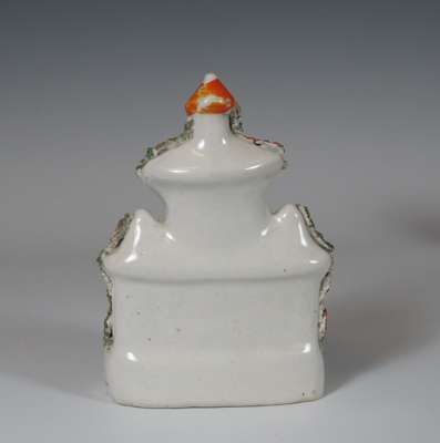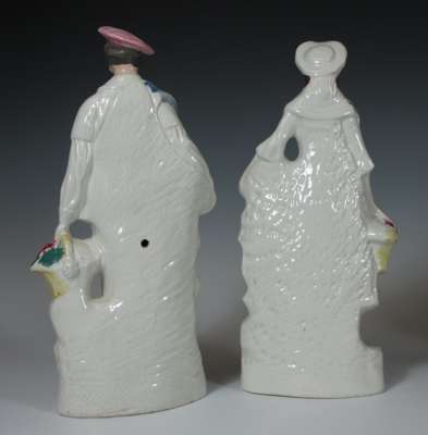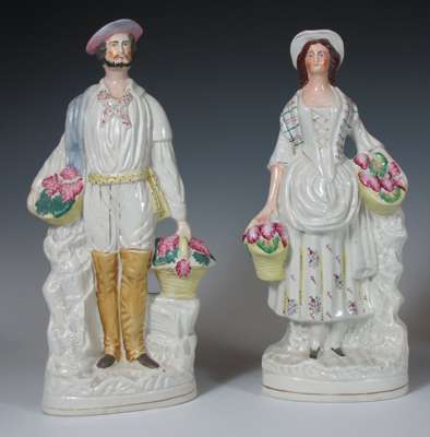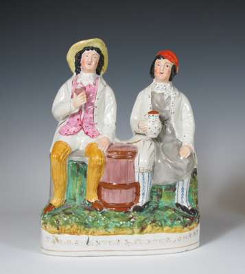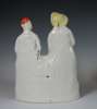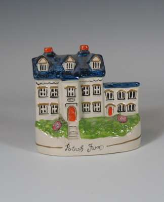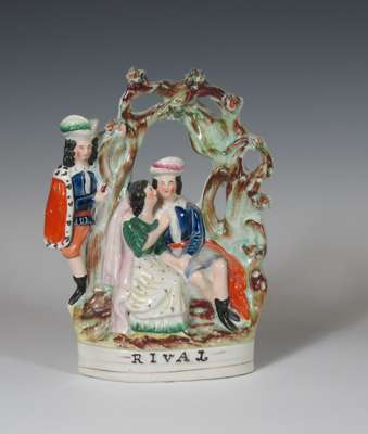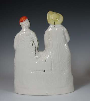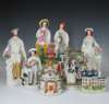 comprising: a double flatback of Tam.O.Shanter and Sooter Johnny', 32cm high; a pair of flatbacks of a man and a woman, 37cm and 36cm high; a flatback of a man and his dog, 25cm high; a flatback titled 'Rival', 25cm high; a flatback of a two storey house, 18.5cm high; and a flat back of a three storey house titled 'Potash Farm', 14cm high (7)