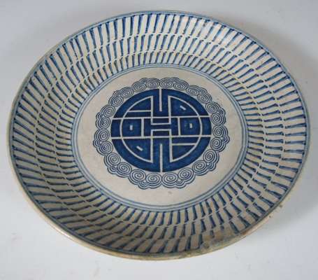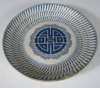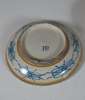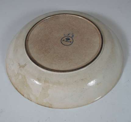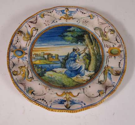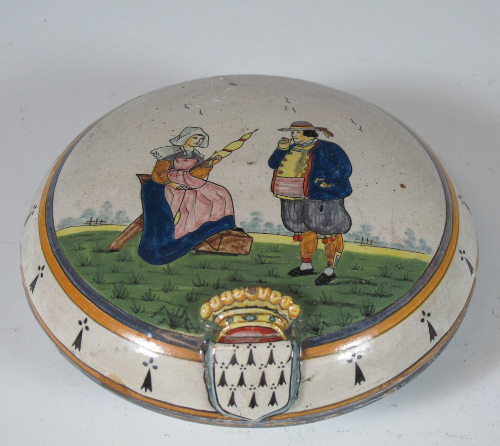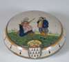 comprising: a polychrome painted plate of circular form decorated with a woman in a landscape, 21.5cm diameter; a blue painted plate in the Chinese style, 27.5cm diameter; and a circular box and cover, decorated with an armorial and a man and a woman in a landscape, 17.5cm diameter (3)