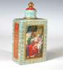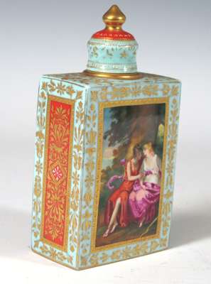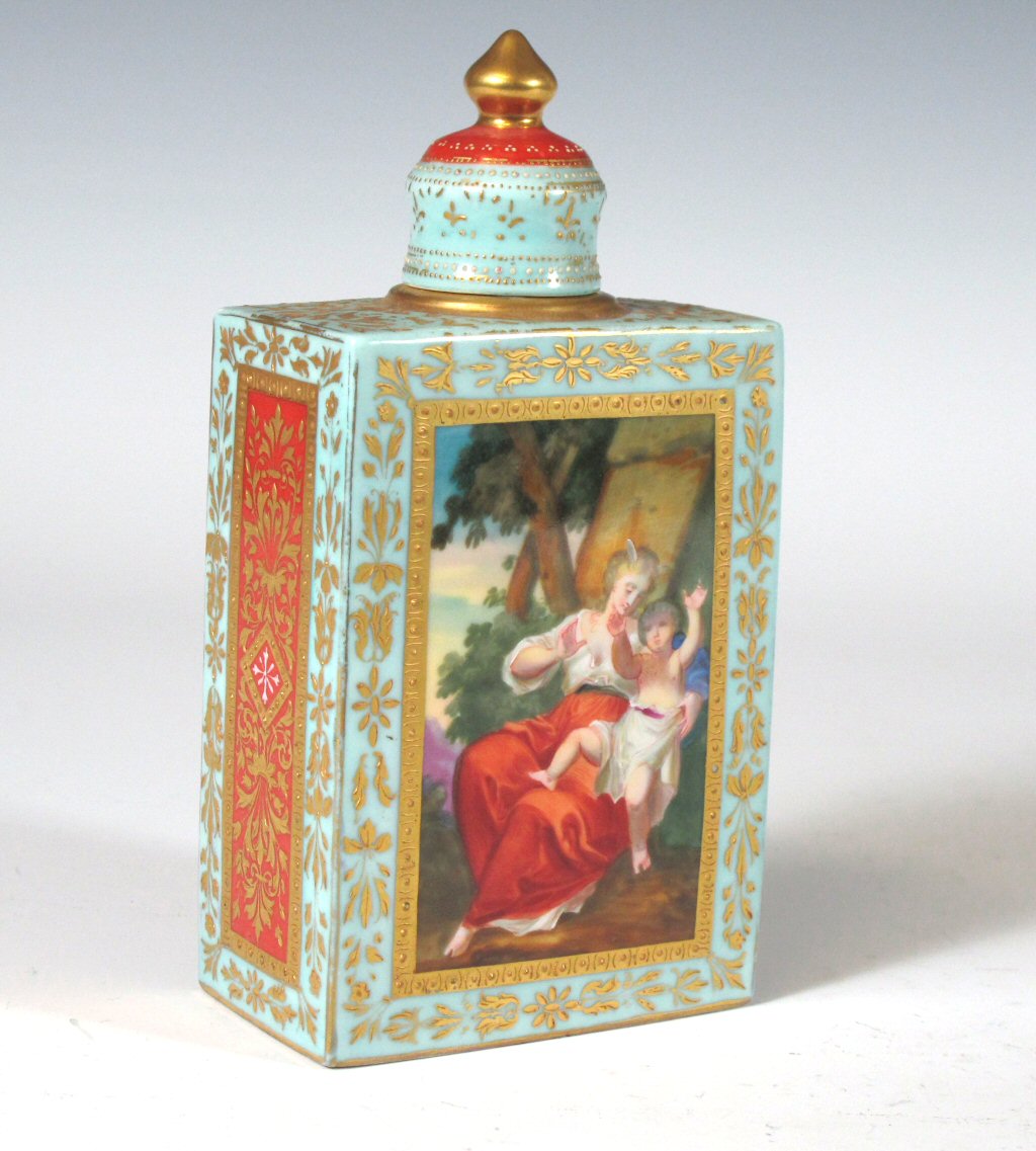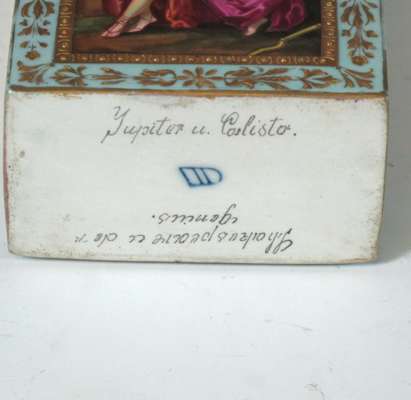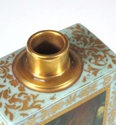 decorated with opposing figural scenes, on a light blue ground with gilt highlights, blue beehive mark