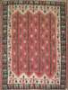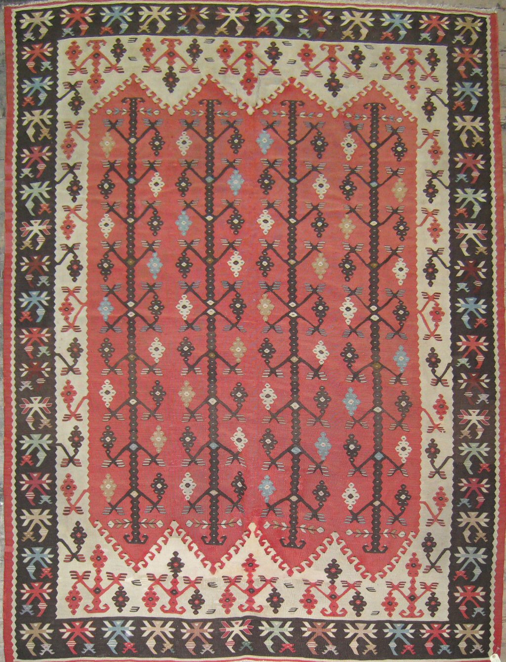 late 19th/early 20th century, the red field with four stylised vine poles, within ivory and brown borders
