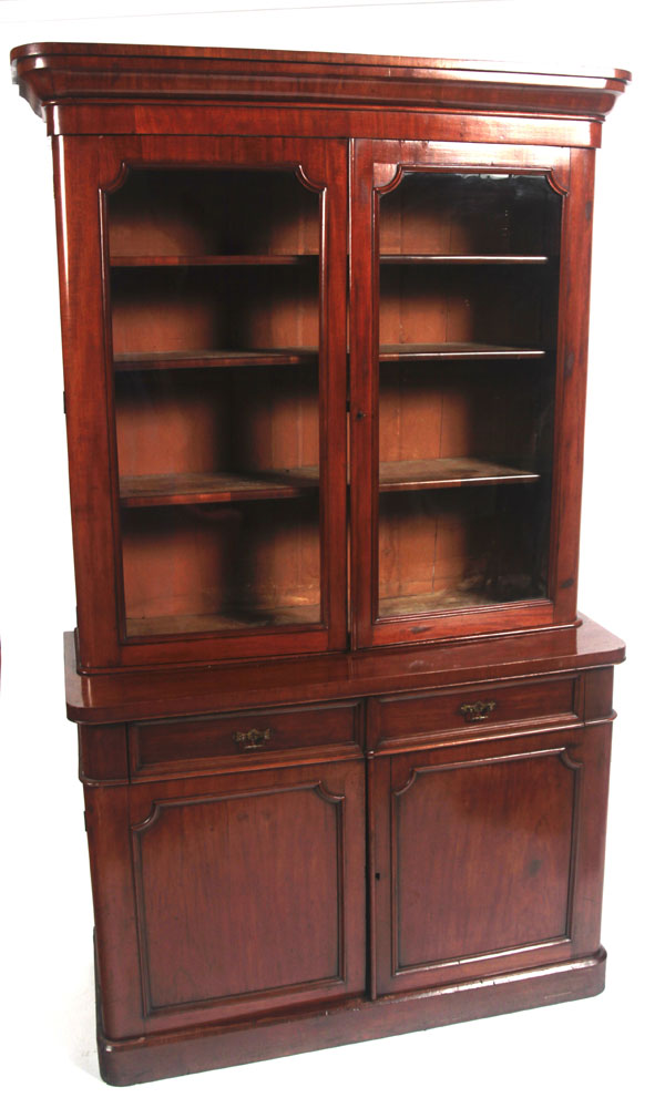 the projected rounded moulded cornice over two astragal glazed doors enclosing adjustable shelves over two moulded short drawers and two panelled doors, raised on plinth base