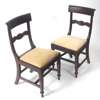 each with scroll tablet top-rail over horizontal scroll carved splat, drop-in pad seat, raised on ring turned legs, united by stretchers