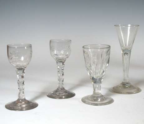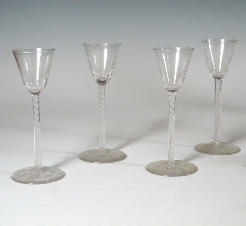 comprising: four glasses each with funnel bowl, faceted opaque twist stem and conical foot, 14cm high; two glasses each with ogee bowl, faceted stem and conical foot, 12cm high; and a group of five other glasses (11)