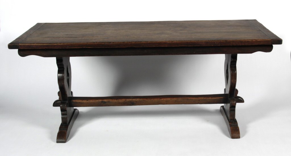 the rectangular plank top raised on liar legs, raised on shaped legs united by a single stretcher
