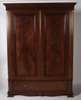 the projected moulded cornice over a boxwood, strung frieze panel, two panelled doors enclosing hanging space and drawers, flanked by fluted columns, over a single long drawer, shaped apron, raised on ogee bracket feet