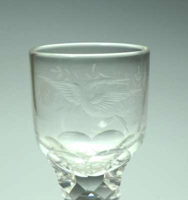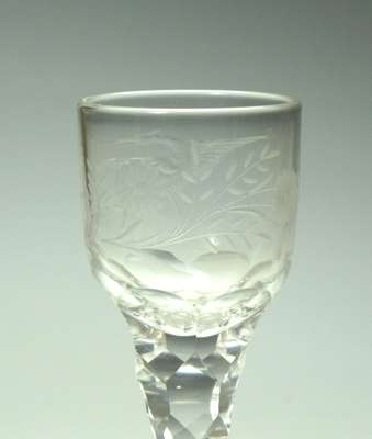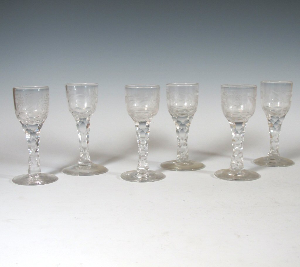 each with a floral etched ogee bowl, faceted stem and conical foot (6)