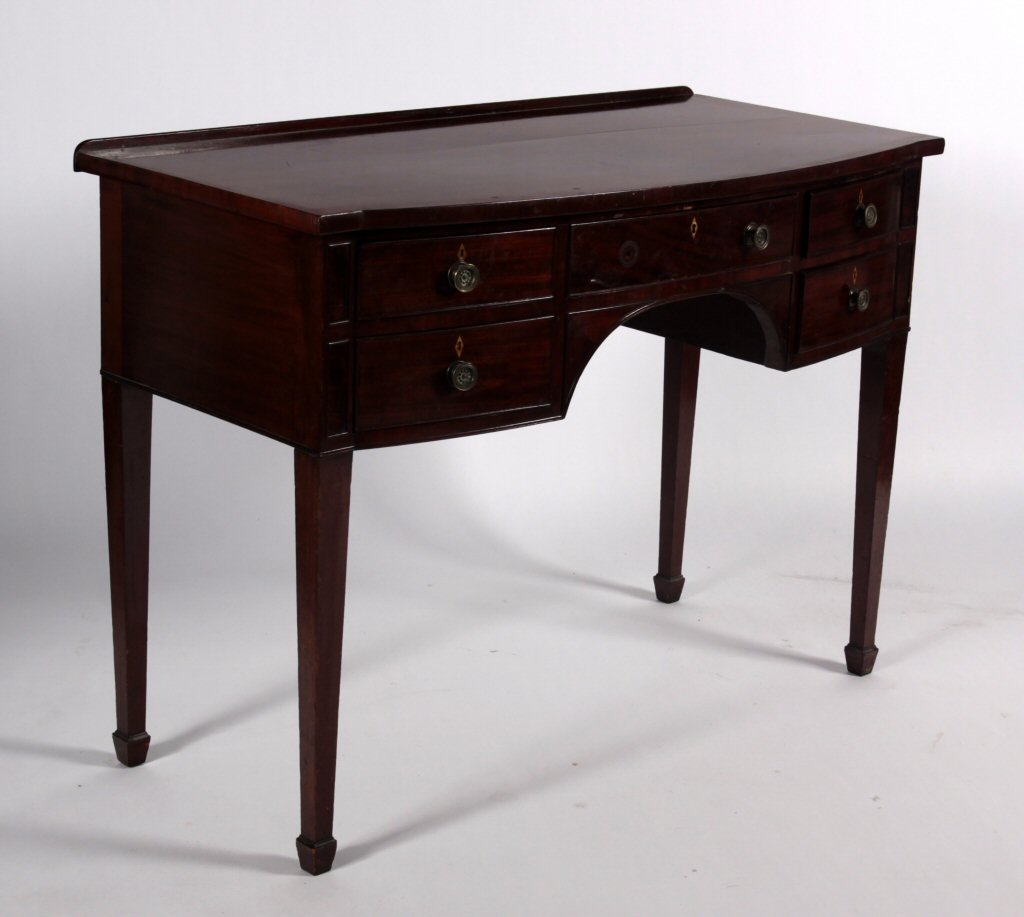 of small proportions, three frieze drawers over a kneehole, flanked by deep drawers raised on square tapering legs terminating in spade feet