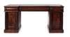 the moulded top over frieze barrel shaped long drawer, flanked by short drawers over pedestal panelled cupboard, raised on plinth base's