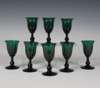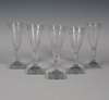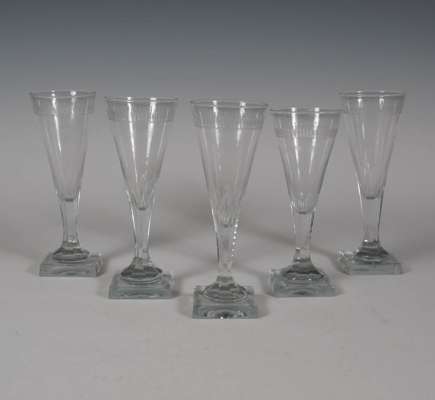each with bell bowl, baluster stem and conical foot, 12cm high (one damaged); and five ale flutes, each with etched funnel bowl, faceted stem and square base, 16cm high (13)