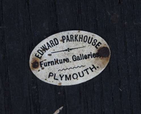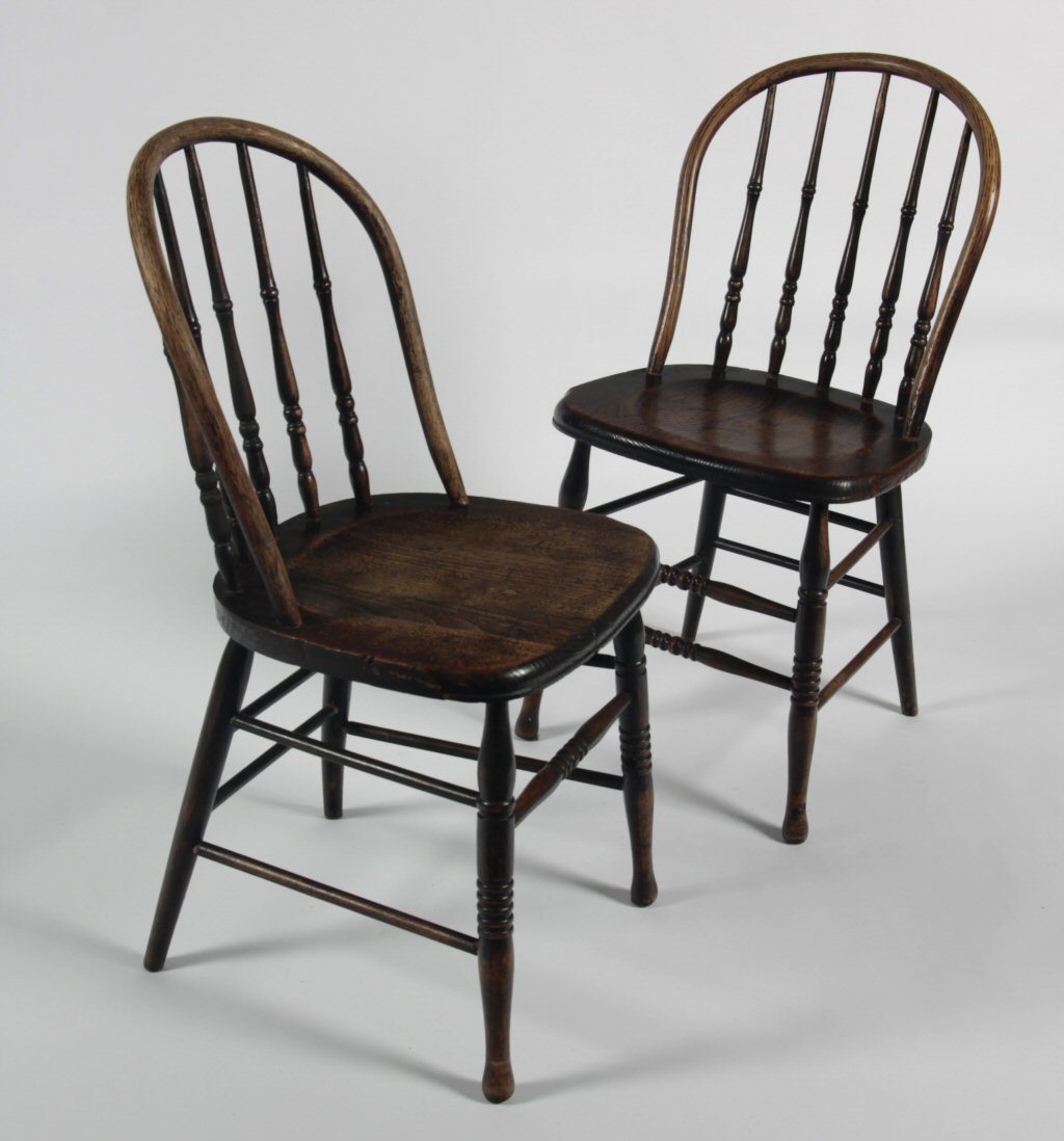 each with hoop back over ring turned vertical splats, shaped seat, raised on splayed ring turned legs united by stretchers, one with plastic disk inscribed 'Edwards Park House, Plymouth, furniture gallery', another stamped 'K P' (4)