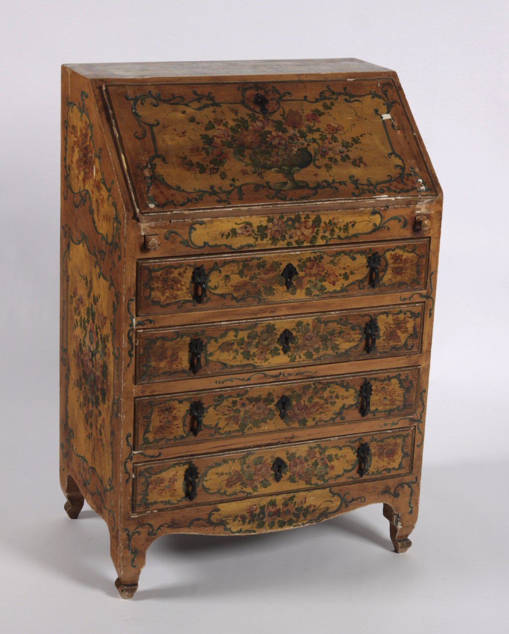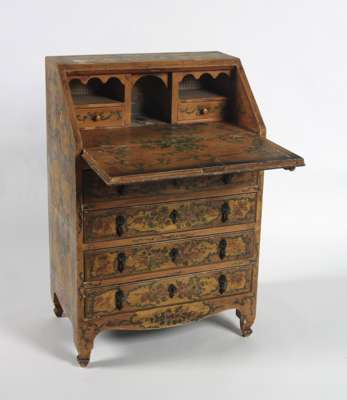of small proportions, the fall-flap enclosing simple fitted interior, over four graduated long drawers, serpentine apron, raised on shaped bracket feet