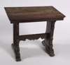 the chamfered rectangular top over a plain frieze, panelled legs with scrolling brackets, united by shaped stretchers