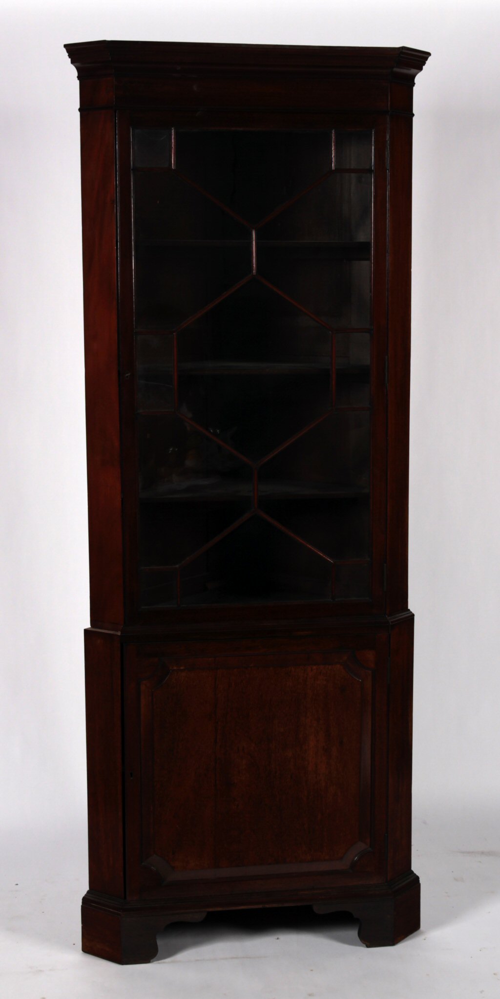 the projected moulded cornice with canted corners over astragal glazed doors above a panelled cupboard door, raised on bracket feet
