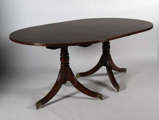 the reeded cross banded rounded rectangular top raised on baluster turned supports above reeded tripod sabre legs terminating in hairy paw caps and castors; including an additional three leaves and pedestal
