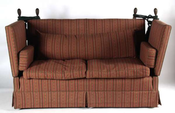 the high back over swing arms, loose cushioned seat, raised on bun feet, the whole covered in faded pink and green patterned stripes