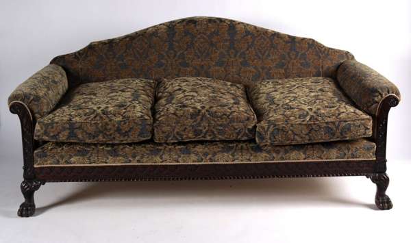 the arched cushioned back over scroll arms with foliate carved panels, cushioned seat, gadrooned apron, raised on lion paw feet