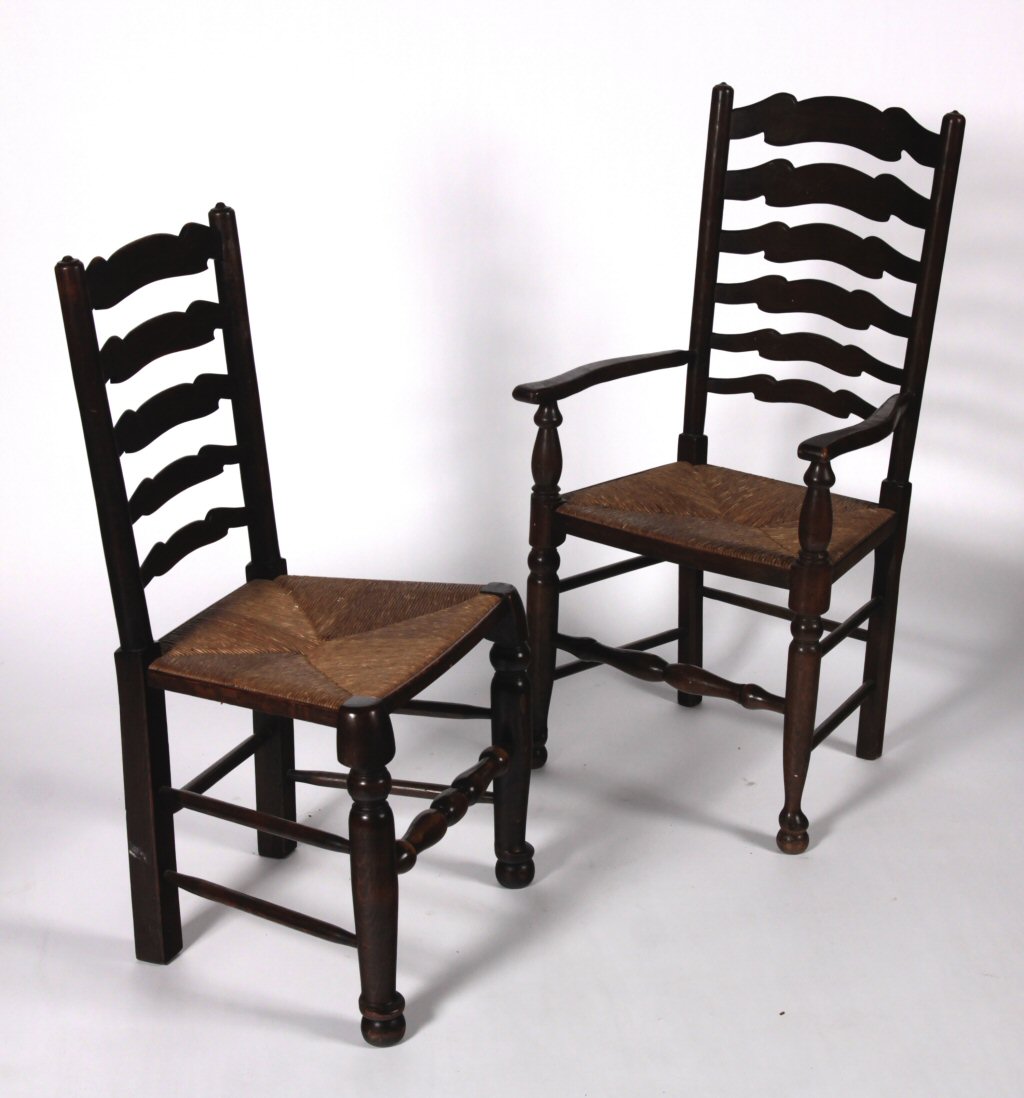 each with five serpentine horizontal splats on turned supports, over a rush seat, raised on ring turned legs terminating in pad feet, united by stretchers; including two carvers (8)