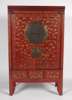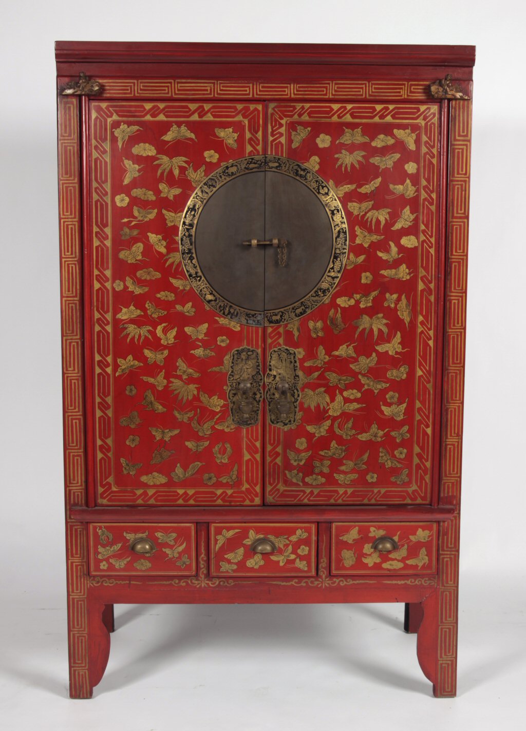 the moulded frieze cornice over two doors with large circular lock plate, three short drawers, raised on block feet, the whole decorated with butterfly and flowers