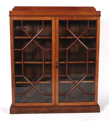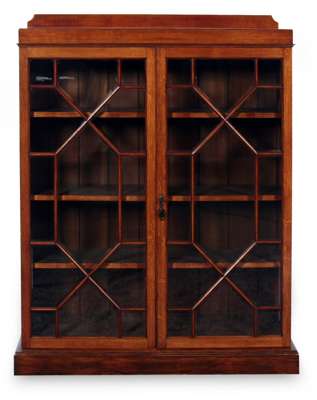 the rectangular top over two astragal glazed doors enclosing adjustable shelves, raised on plinth base