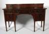 the ledge back with frieze doors, boxwood stung top three drawers over kneehole flanked by two cupboards, raised on square tapering legs terminating in spade feet