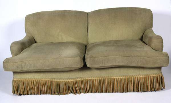 the double arched cushioned back over deep loose cushioned seat, raised on squat baluster turned legs terminating in brass caps and castors, the whole in pale green